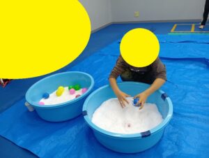お友達と手を埋めたりコップにいっぱい詰めたり