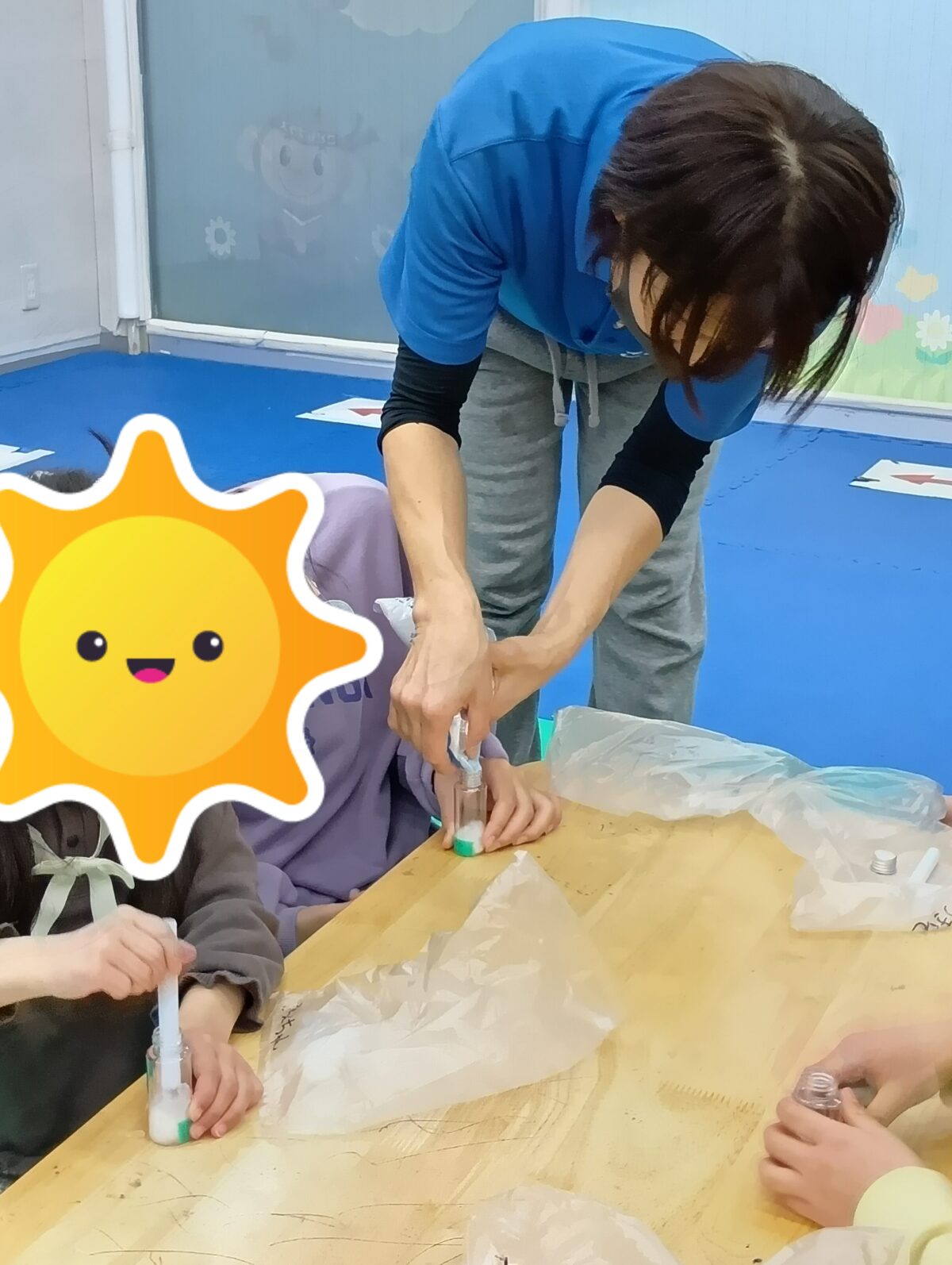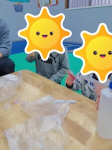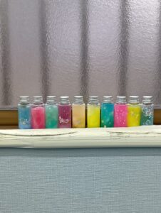 保冷剤を活用して、キラキラをたくさん入れ、色のついた洗濯のりを入れてフリフリ‼
