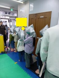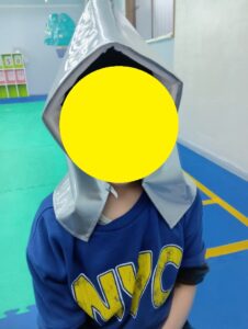 訓練が始まる前にみんなで防災頭巾を被る練習をしました